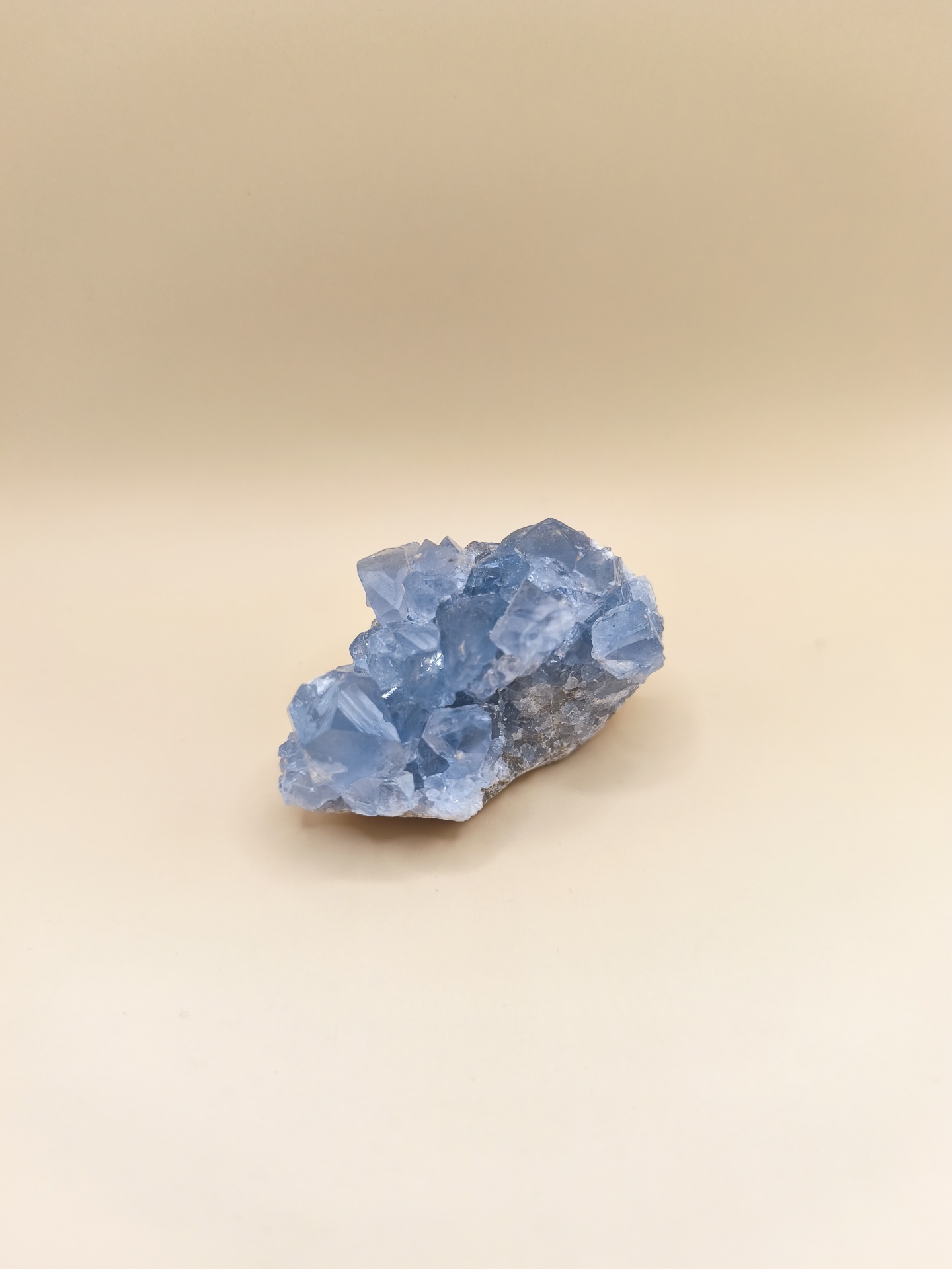 A Celestite é um cristal de cor azul-pálido, delicado e translúcido, que costuma se formar em drusas — grupos de pontas cristalinas que crescem juntas, imanando a sua energia.