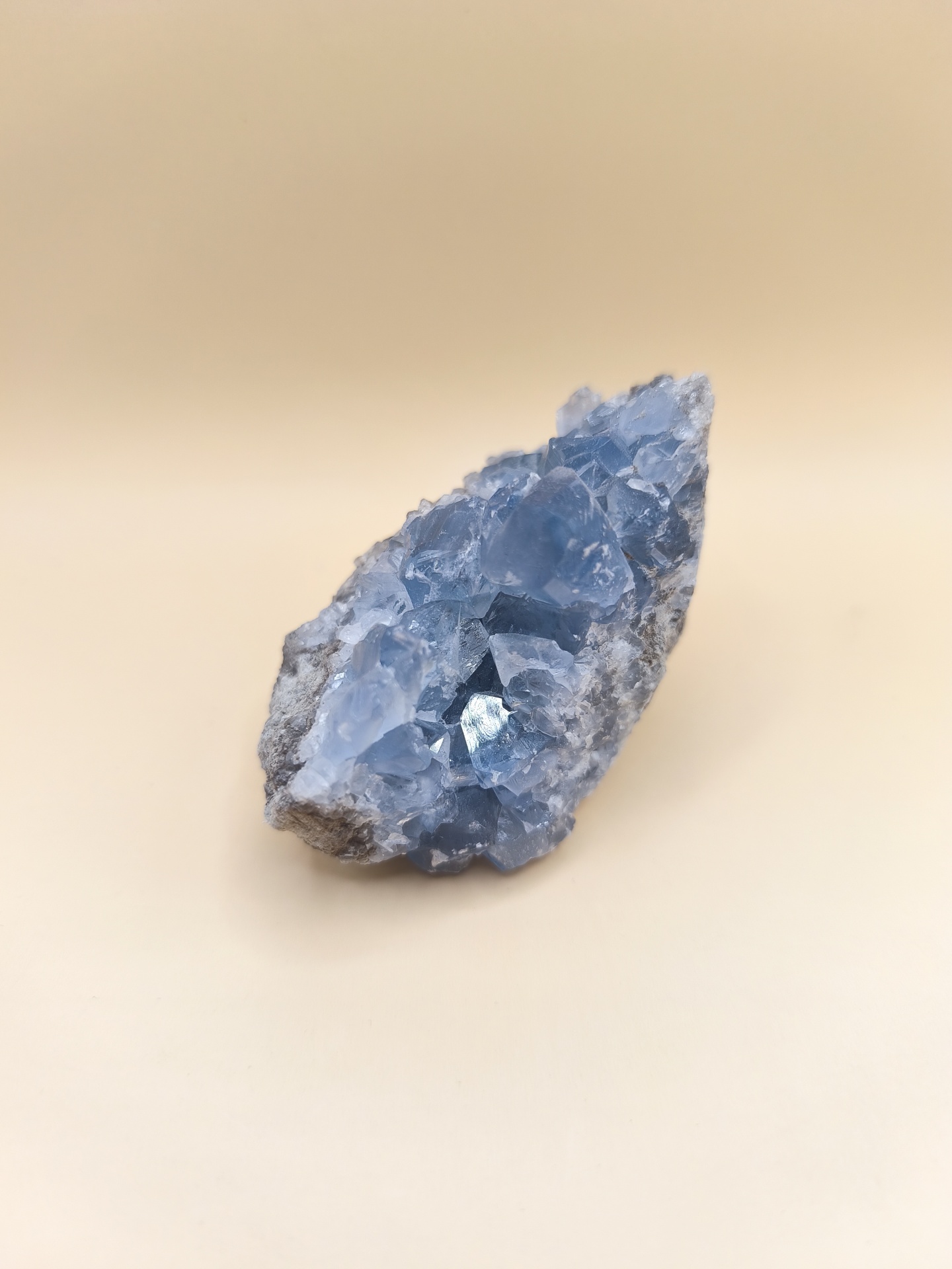 A Celestite é um cristal de cor azul-pálido, delicado e translúcido, que costuma se formar em drusas — grupos de pontas cristalinas que crescem juntas, imanando a sua energia.