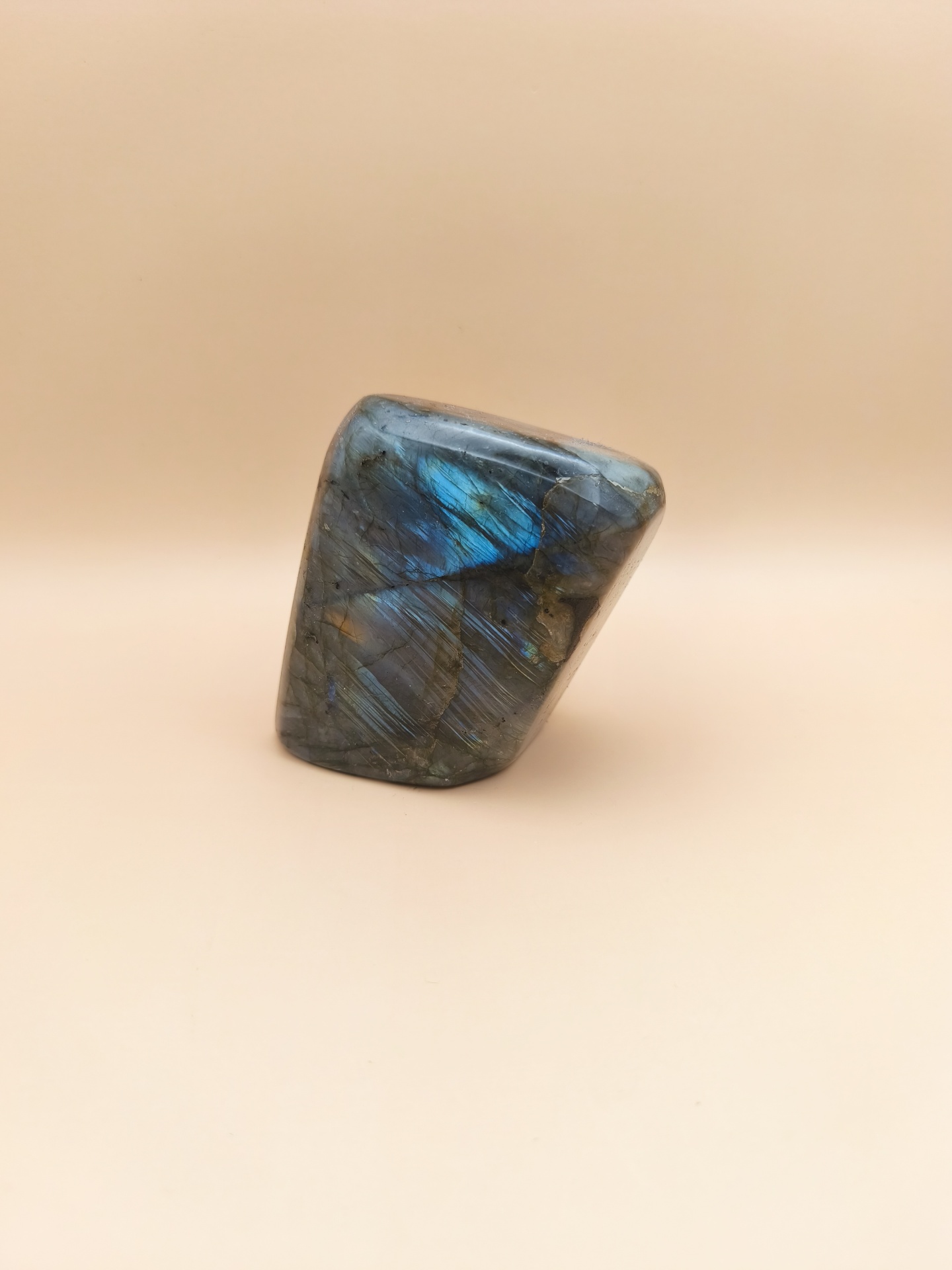 A labradorite é uma pedra semipreciosa conhecida pelo seu brilho místico e iridescente, chamado de labradorescência, que reflete tons metálicos de azul, verde, dourado, laranja e até roxo. É considerada uma pedra de proteção, transformação e intuição, muito usada em práticas espirituais, meditação e como amuleto energético.
